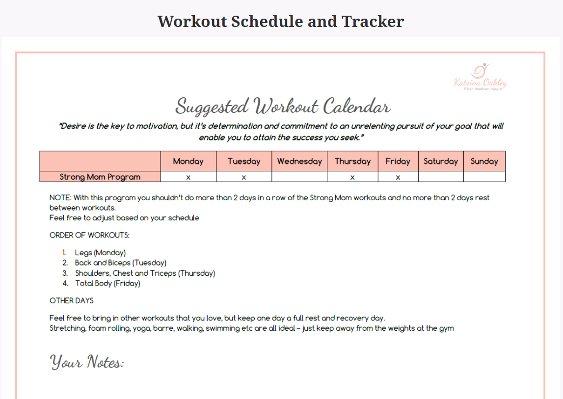 "The Strong Mom program is by far the best workout I’ve done, I love how it combines weights, cardio and DR safe core work all in one compact workout. I was skeptical I would be able to get a solid weight and cardio program done in 30 minutes, but Katrina has done it. The weights are fast paced but not rushed, form is never sacrificed, and I have upped my weights along the way. I can tell I am getting stronger. The cardio is HIIT, so we can get sweating (but I am already from the weights) in just 9 minutes! Then the final section is DR safe core workout with many different levels so everyone can participate. A short warm up and cool down round out the program. I love the flexibility of 4 days of workouts too, you can add in other workouts or just rest.   "