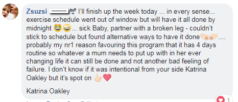 "Loved this program! Was a great workout that really made me feel I was pushing my limits, but I could still trust was safe for my diastasis recti. Loved how the workouts were so efficient with so much being packed into a short span of time, made it so nice and easy to get the workouts in. Katrinas high energy and prompting throughout the workouts helped to give me amped up from beginning to end! 5 stars!!!!